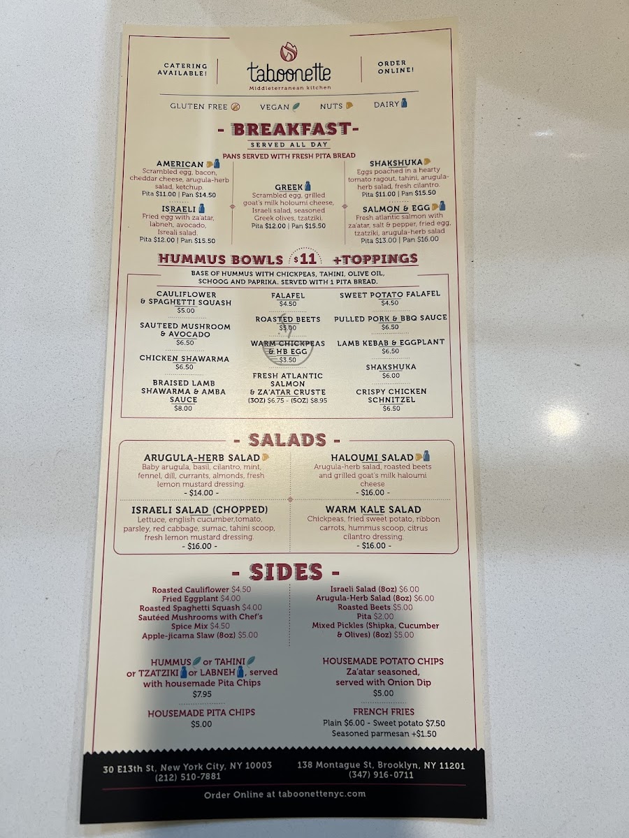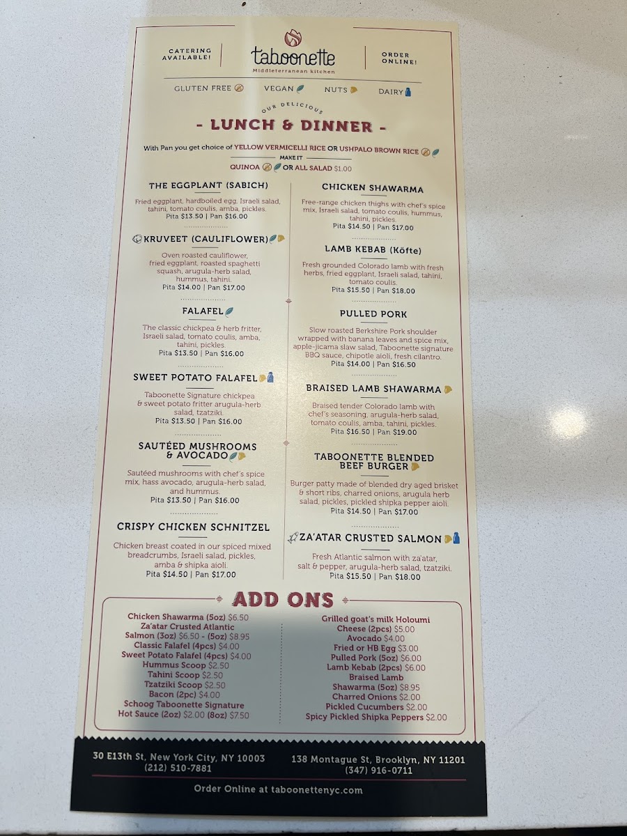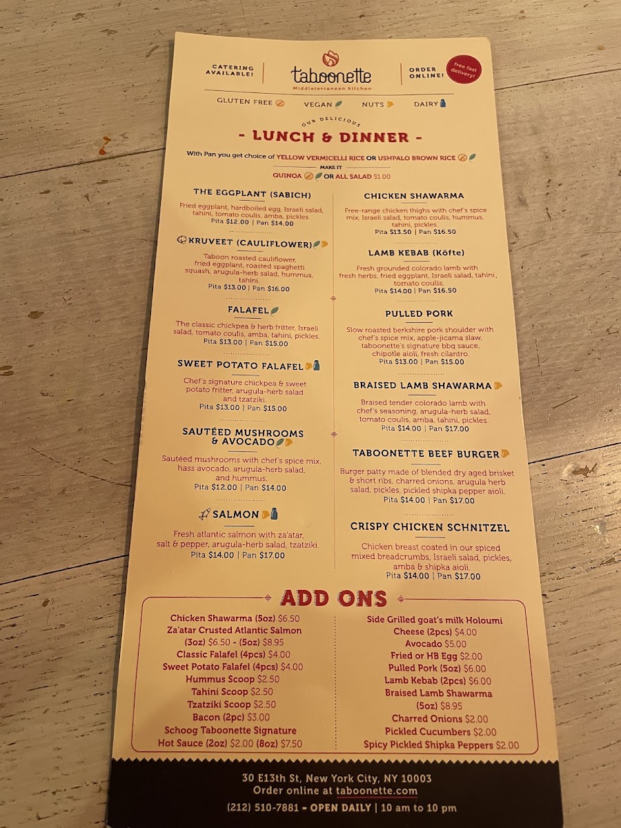 Nestled in the vibrant heart of New York City, Taboonette is a delightful Mediterranean restaurant that invites you to experience authentic flavors in a warm, community-driven atmosphere. Located just steps away from Union Square at 30 E 13th St, this cozy eatery combines traditional Mediterranean culinary influences with a modern flair, making it a must-visit spot for both locals and visitors alike.
