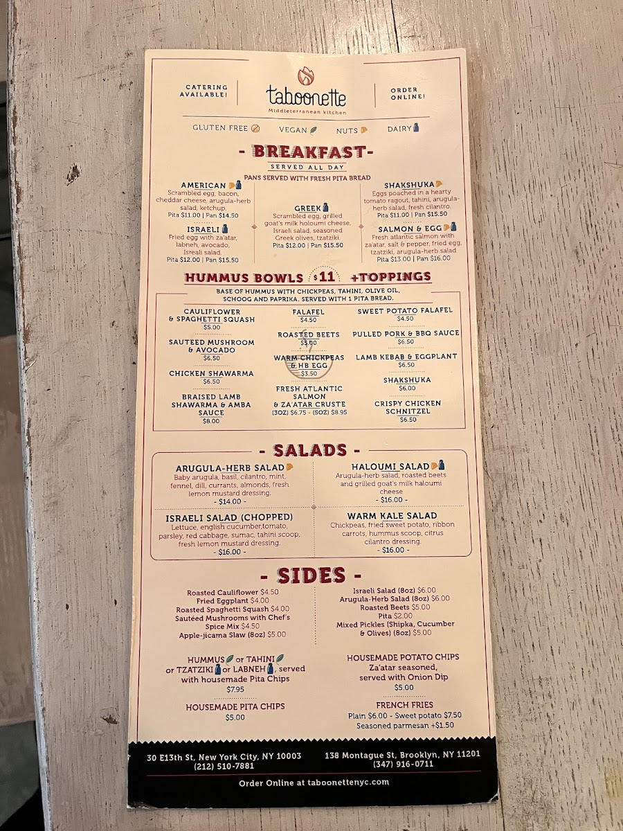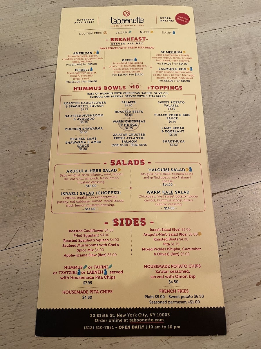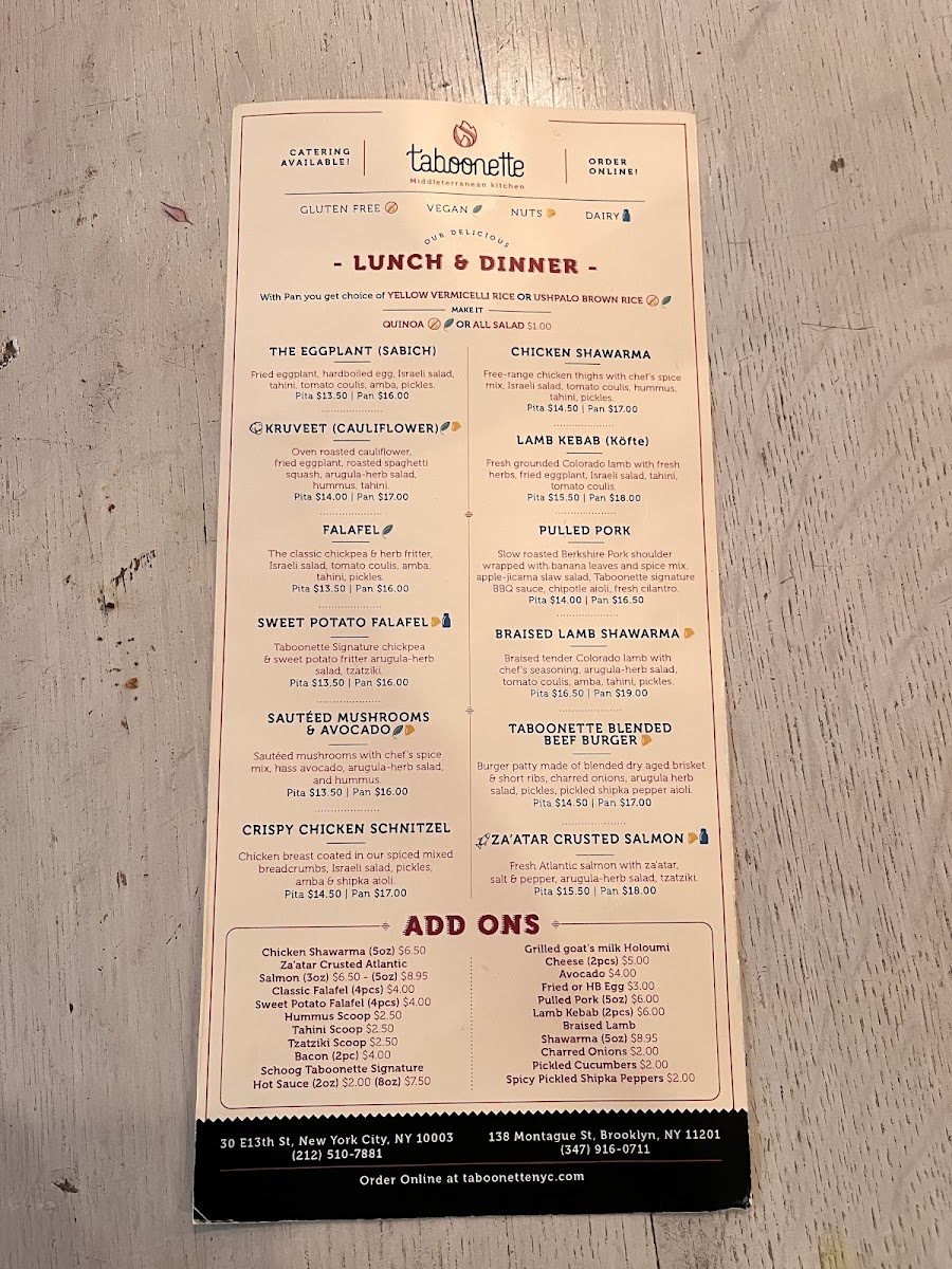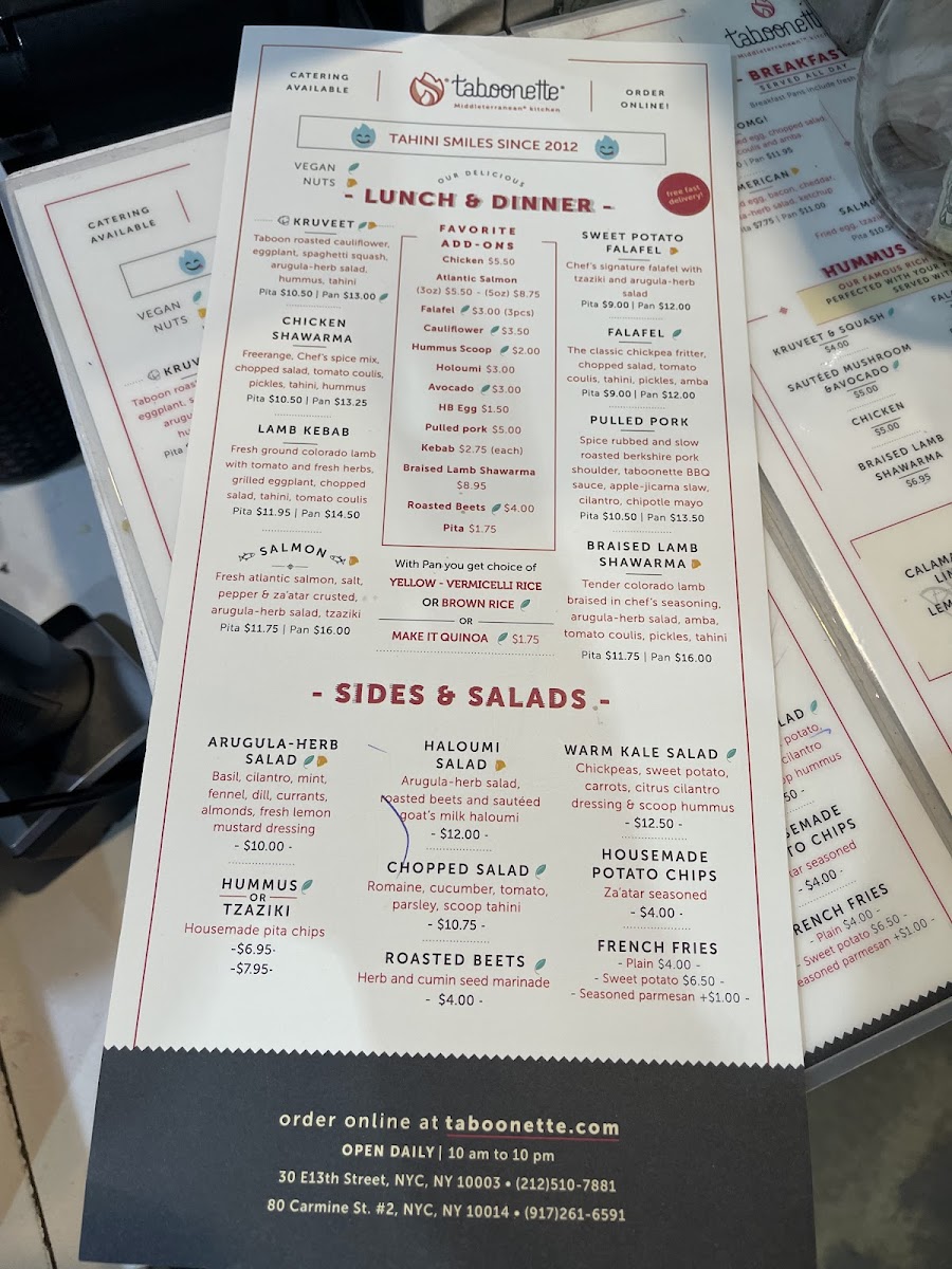 Nestled in the vibrant heart of New York City, Taboonette is a delightful Mediterranean restaurant that invites you to experience authentic flavors in a warm, community-driven atmosphere. Located just steps away from Union Square at 30 E 13th St, this cozy eatery combines traditional Mediterranean culinary influences with a modern flair, making it a must-visit spot for both locals and visitors alike.