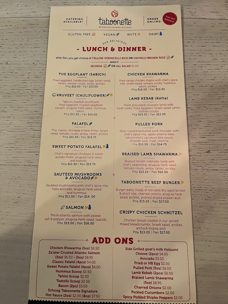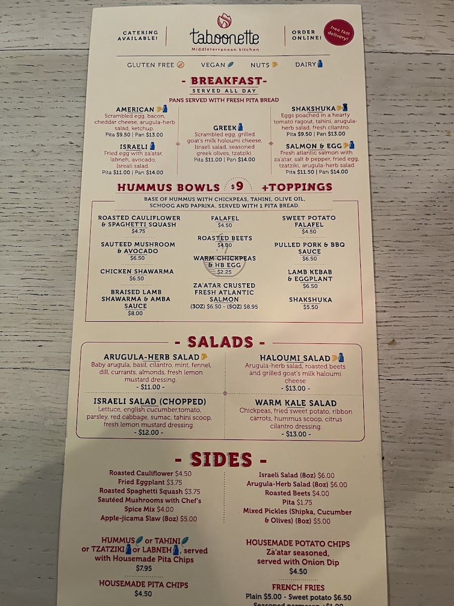 The menu at Taboonette showcases a plethora of delectable options that cater to diverse tastes. Whether you're in the mood for something hearty or light, there’s something for everyone: