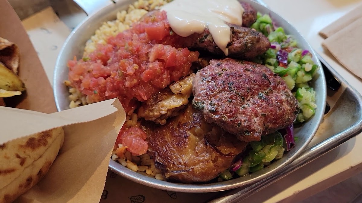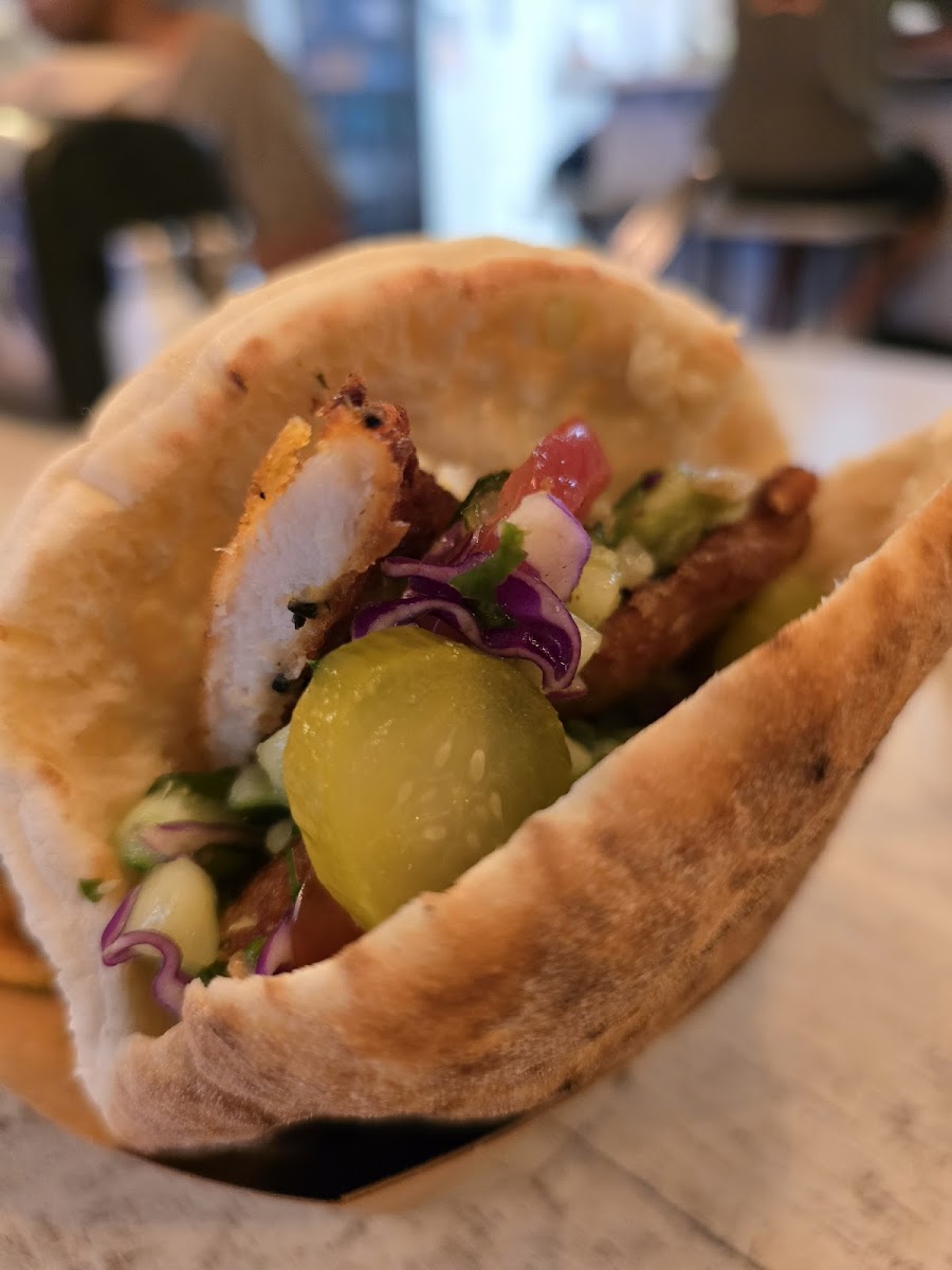 - Crispy Chicken Schnitzel Pita - Indulge in tender chicken breast coated in spiced mixed breadcrumbs, complemented by a refreshing Israeli salad, pickles, amba, and shipka aioli for just US$15.50.